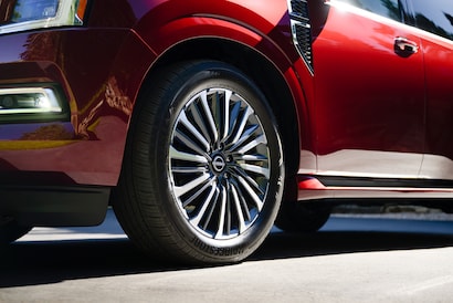The 2026 Armada boasts an impressive exterior that showcases its strength and capabilities. With an overall length of 209.6 inches and a max width of 92.5 inches without mirrors, the Armada commands attention on the road. The SUV sits at a height of 76.9 inches, offering excellent visibility for the driver. The SV trim features 18-inch aluminum-alloy wheels, while the Platinum trim takes your road presence up a few notches with 22-inch Machine-finished aluminum-alloy wheels.